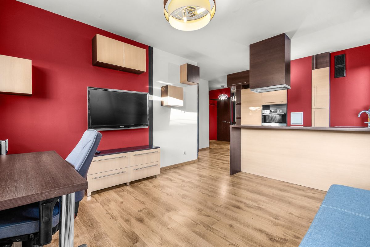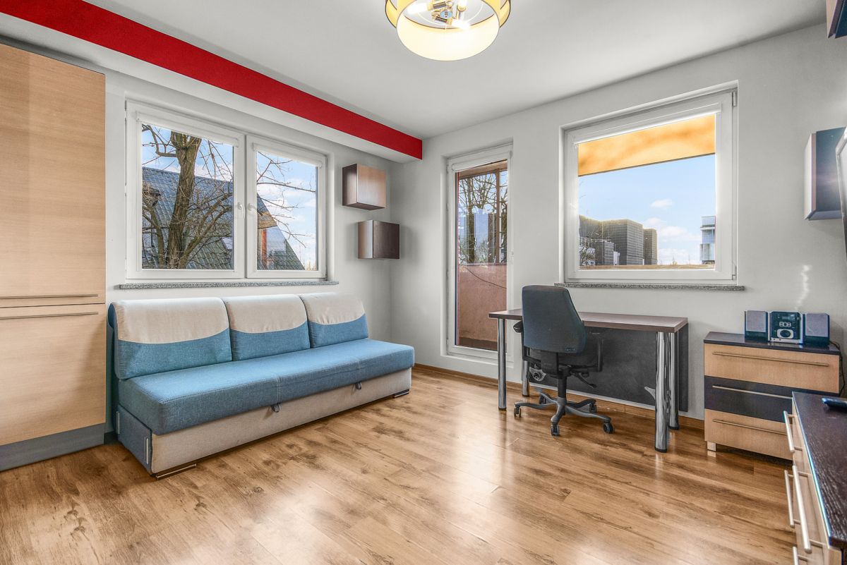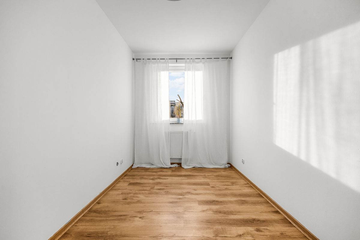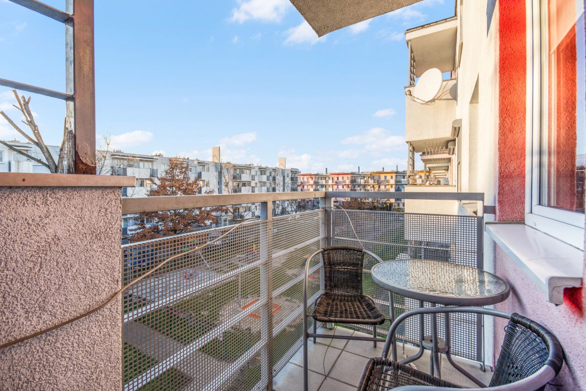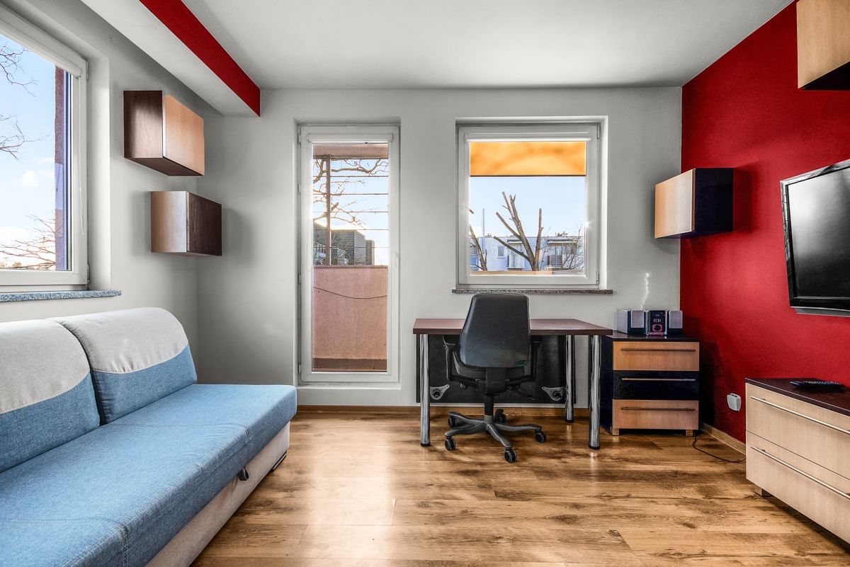 Mieszkanie składa się z 2 sypialni, łazienki, przedpokoju i sporego salonu z aneksem kuchennym. Do salonu przylega nasłoneczniony balkon.